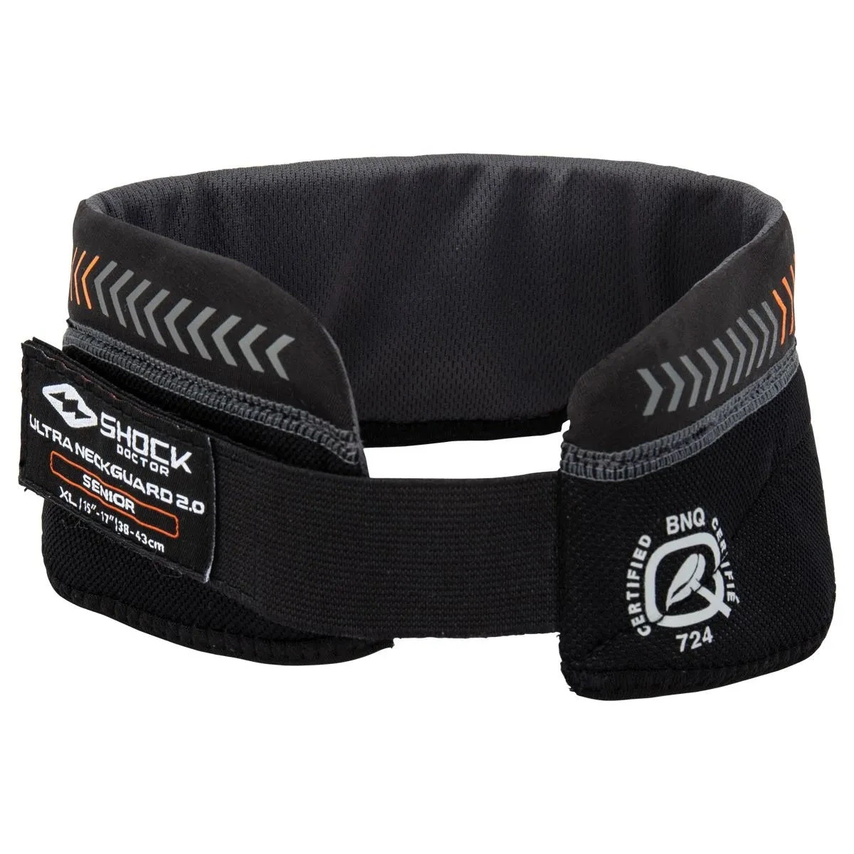 - Stay safe all game long with the Shock Doctor Ultra 2.0 Neck Guard. Created with the ultimate athletic protection in mind, this flexible, anatomically designed neck guard will BNQ certified and cut resistant.