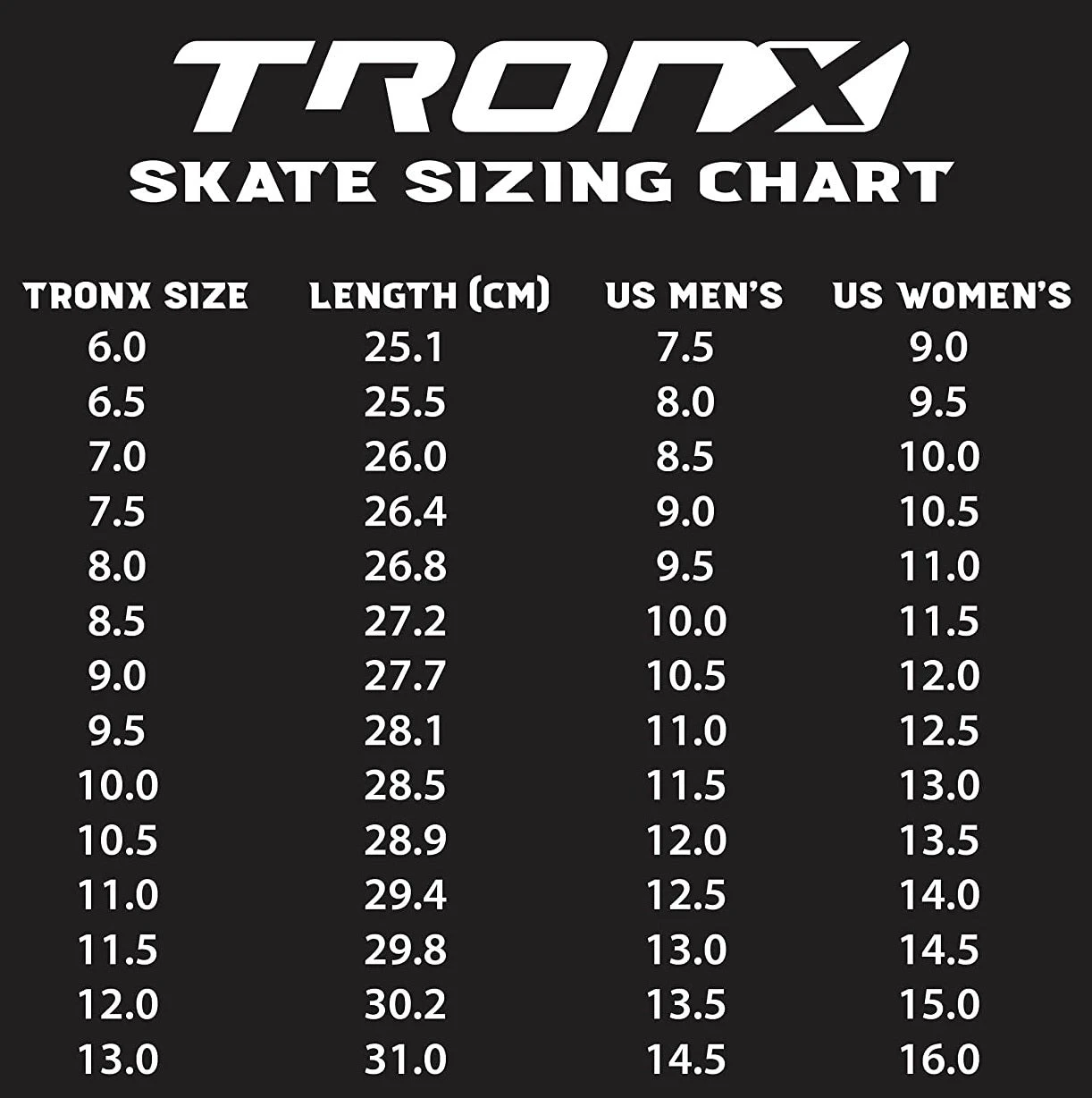 | Skate Size | 6.0, 6.5, 7.0, 7.5, 8.0, 8.5, 9.0, 9.5, 10.0, 11.0, 12.0 |